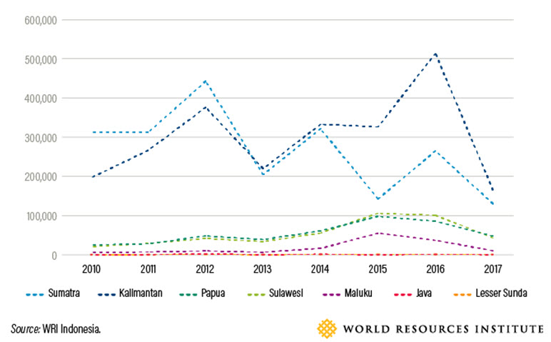 Kalimantan dan Sumatera mengalami penurunan kehilangan hutan primer terbesar antara tahun 2016 dan 2017, masing-masing sebesar 68 persen dan 51 persen, dengan penurunan terbesar di Sumatera Selatan, Kalimantan Tengah dan Jambi. Namun, Sumatera Barat dan Sumatera Utara masih mencatatkan peningkatan tingkat kehilangan tutupan hutan.