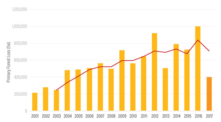 Walau pada tahun 2017 dunia mencatat tahun terburuk kedua dalam hal tingkat kehilangan tutupan pohon tropis, di tahun yang sama ada secercah harapan di Indonesia: tingkat kehilangan tutupan pohon di hutan primer mengalami penurunan 60 persen dari tahun 2016. Penurunan tingkat kehilangan hutan primer tersebut mengurangi emisi karbon dioksida sebesar 0,2 gigaton atau setara dengan emisi dari pembakaran lebih dari 90 juta ton batu bara (199 miliar pon batu bara).
