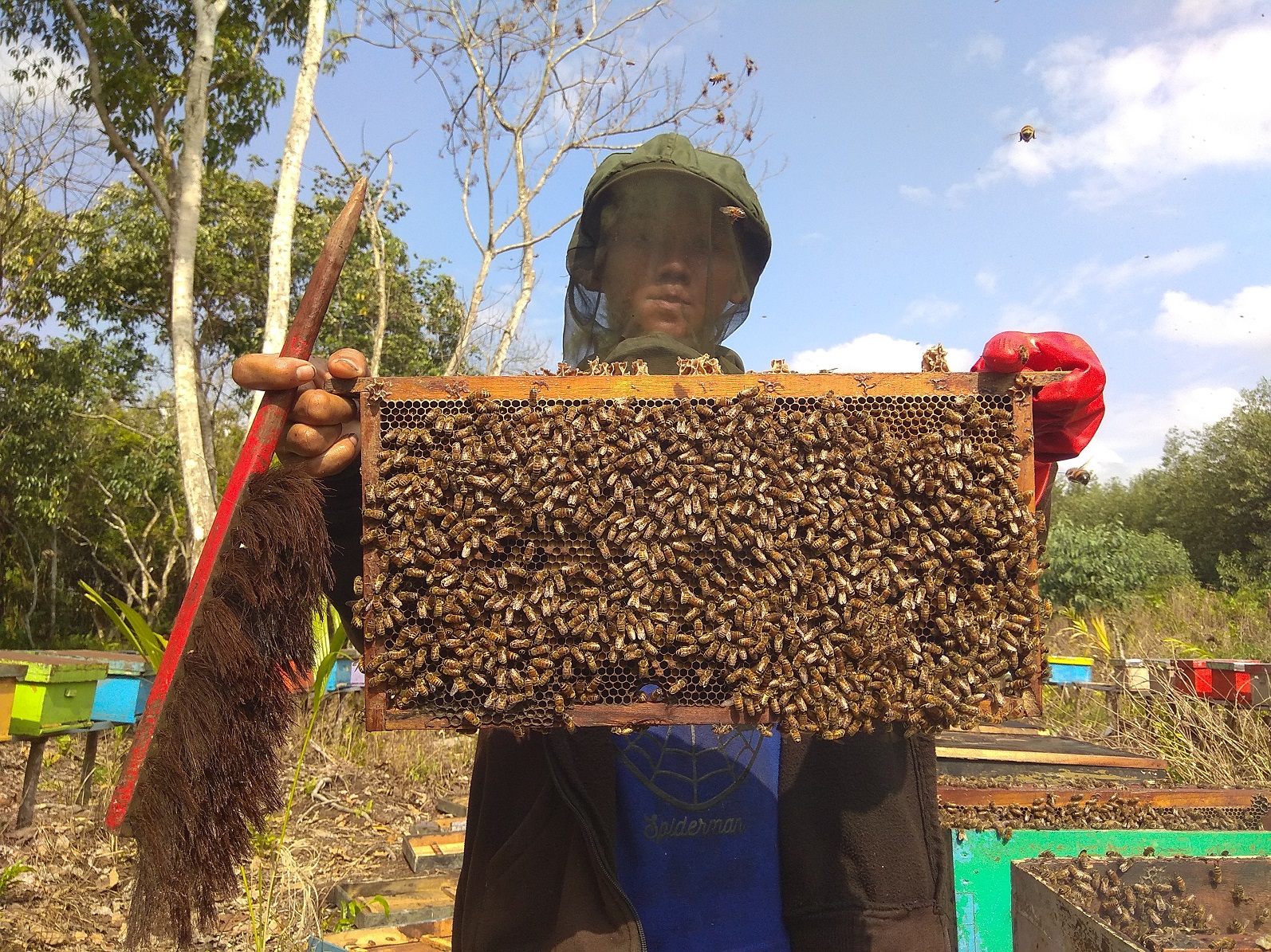 “Cair bantuan kedua, kami belikan lagi 20 kotak lebah, kami tarok di Desa Rantau Karya, Alhamdulillah tahan sampai sekarang.”
