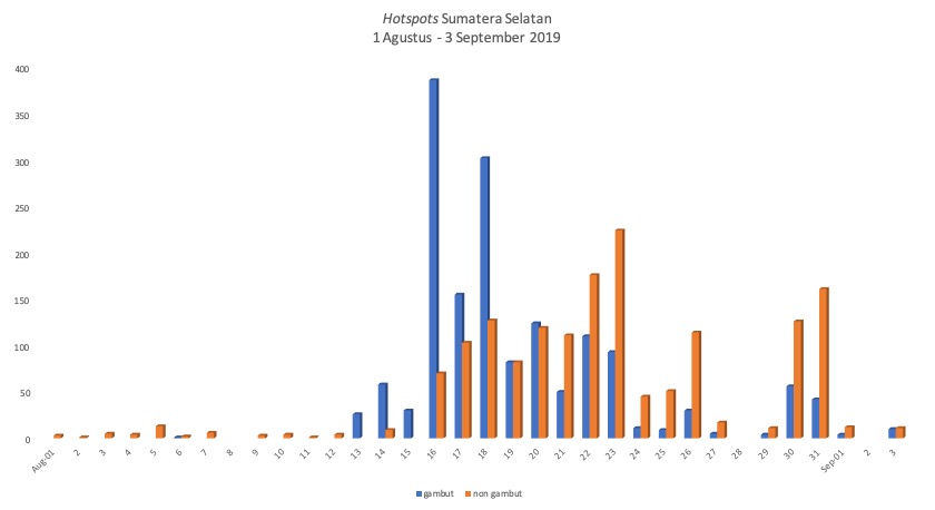 Dari tahun ke tahun, puncak musim kemarau, yang biasanya terjadi pada Agustus hingga September, merupakan waktu rawan terjadinya kebakaran di sejumlah wilayah di Indonesia, termasuk Sumatera Selatan. Pada periode 1 Agustus hingga 3 September 2019 ini, sebanyak total 3.203 titik panas dengan tingkat kepercayaan tinggi terpantau di seluruh wilayah Sumatera Selatan. Berdasarkan analisis Pantau Gambut atas kemunculan titik panas yang dihamparkan pada peta gambut dari Balai Besar Sumber Daya Lahan Pertanian (BBSDLP), sekitar 49.5% dari total tersebut, atau 1.588 titik panas, terjadi di lahan gambut. Selama periode pemantauan penginderaan jarak jauh, jumlah titik panas tertinggi di lahan gambut muncul pada 16, 17, dan 18 Agustus 2019.