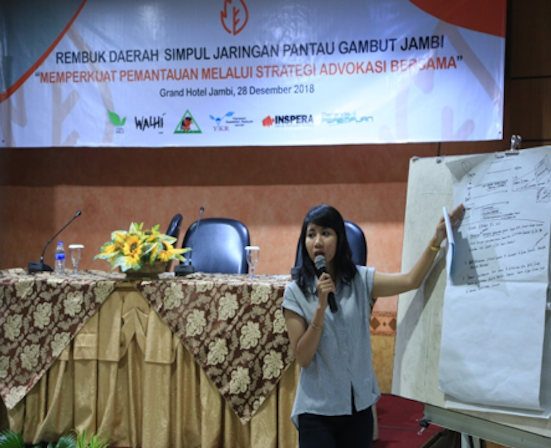 Sementara itu, Angga Septia yang mewakili Simpul Jaringan Pantau Gambut Jambi sekaligus Sekretaris Jenderal Jaringan Masyarakat Gambut Jambi menyampaikan perkembangan kinerja Pantau Gambut dalam 2 tahun terakhir di Jambi. Salah satu kontribusi nyata Simpul Jaringan Pantau Gambut Jambi adalah pemantauan terhadap terjadinya titik api di wilayah konsesi perusahaan yang termasuk dalam lokasi target restorasi gambut dan moratorium pembukaan lahan.