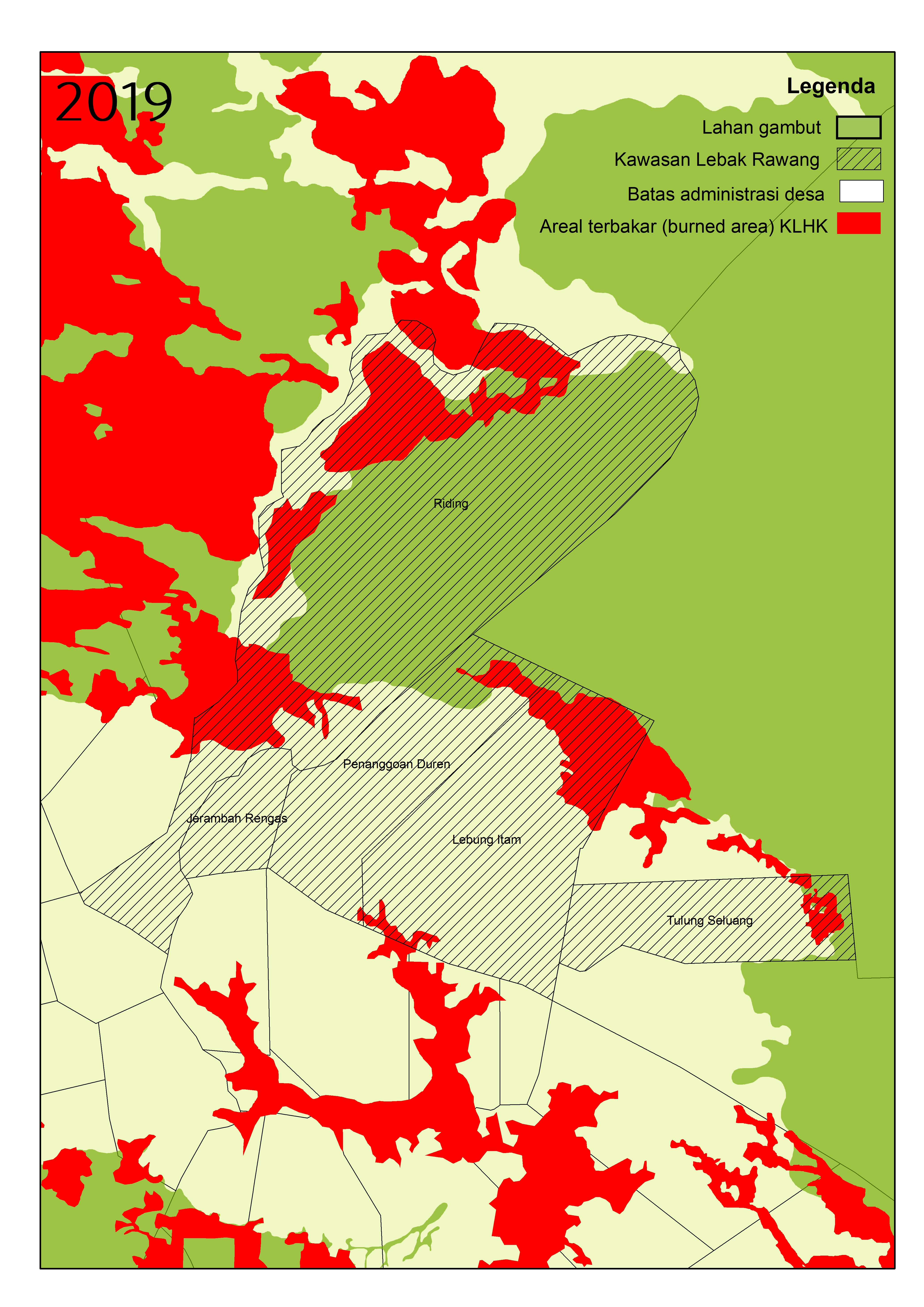 Kawasan Lebak Rawang meliputi lima desa, yaitu Jerambah Rengas, Riding, Penanggoan Duren, Lebung Itam, Tulung Seluang. Pantau Gambut mengamati, bahwa Lebak Rawang memiliki riwayat kebakaran tiap tahun sejak 2015 hingga 2019. Kebakaran paling besar terjadi pada 2015, luasnya 19.292 hektare. Sempat dua tahun tak terjadi kebakaran sama sekali. Pada 2018, kembali terjadi kebakaran luasnya 251 hektare. Pada 2019, luas kawasan kebakaran mencapai 5.895 hektare.