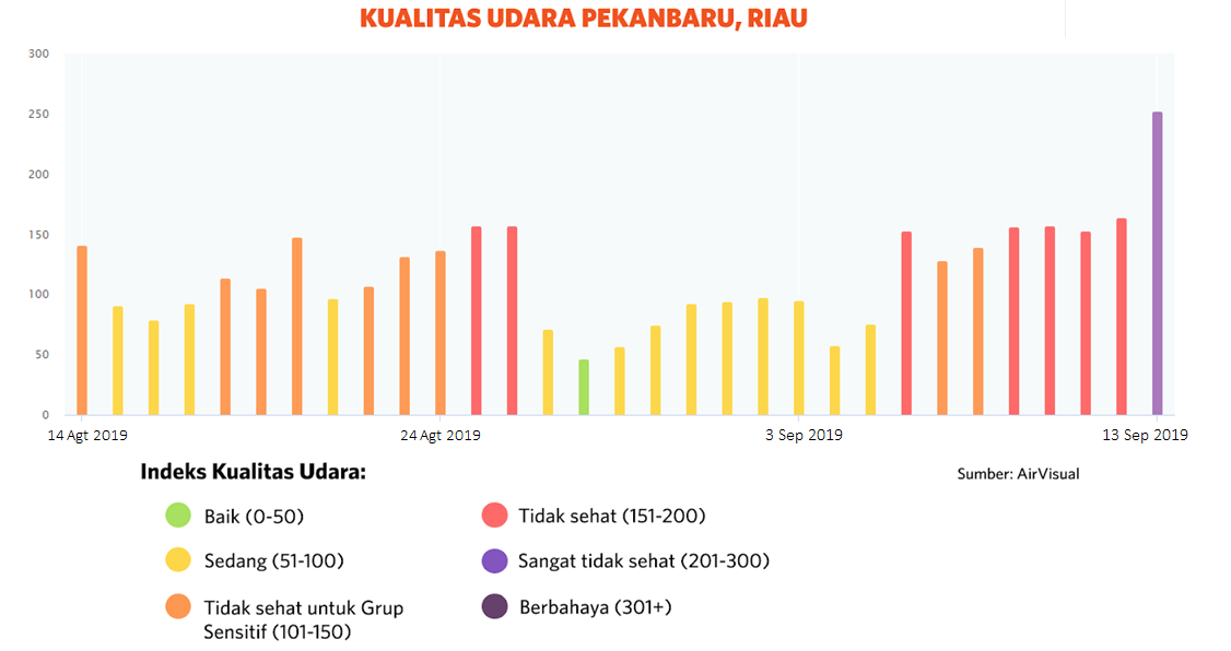 Dalam Periode 14 Agustus – 13 September 2019 data Indeks Kualitas Udara di Pekanbaru menunjukan hasil yang sangat mengkhawatirkan. Bahkan, kualitas udara Pekanbaru per 13 September 2019 masuk dalam kategori “Sangat Tidak Sehat”. Asap yang berasal dari karhutla mengandung campuran gas dan partikel berbahaya, seperti karbon monoksida, karbon dioksida, nitrogen oksida, sulfur dioksida dan lainnya. Selain itu, terdapat partikel-partikel kecil yang ikut terbawa dalam asap (particulate matter) dan dapat menimbulkan gangguan kesehatan bagi siapa saja yang menghirupnya.