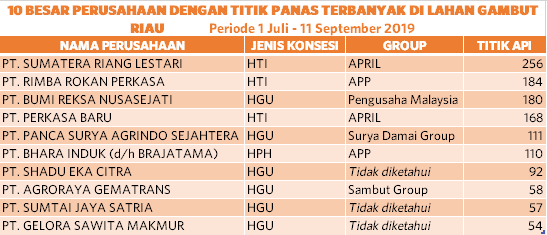 Pantau Gambut menganalisis sebaran perusahaan pada pemegang izin budidaya di kawasan gambut Riau periode 1 Juli-11 September 2019. Hasilnya, teridentifikasi 10 perusahaan dengan jumlah titik panas terbanyak dari seluruh konsesi yang ada di atas lahan gambut.