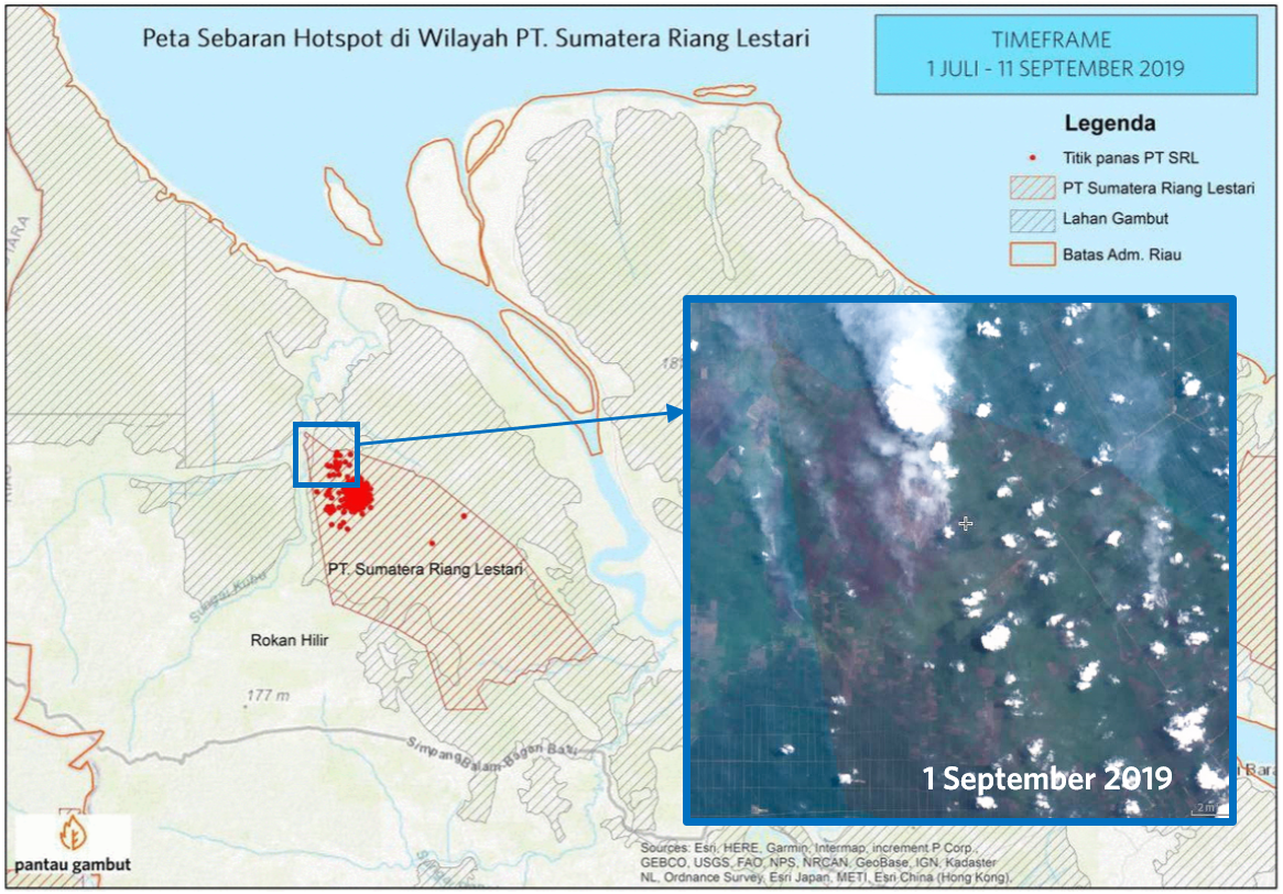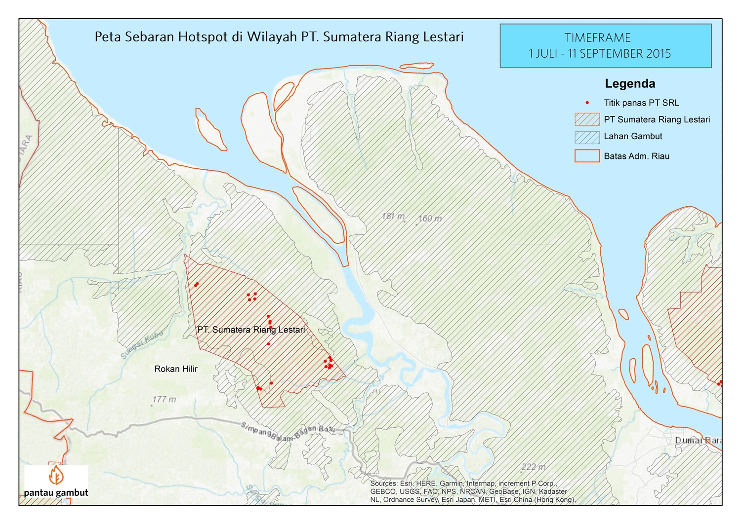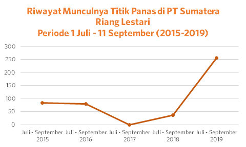 PT Sumatera Riang Lestari (SRL) menjadi jawara untuk jumlah titik panas terbanyak yang muncul di wilayah perusahaannya pada periode 11 Juli - 11 September 2019. PT SRL patut menjadi perhatian karena sudah pernah terjerat kasus kebakaran hutan di dalam wilayah konsesinya pada tahun 2015.