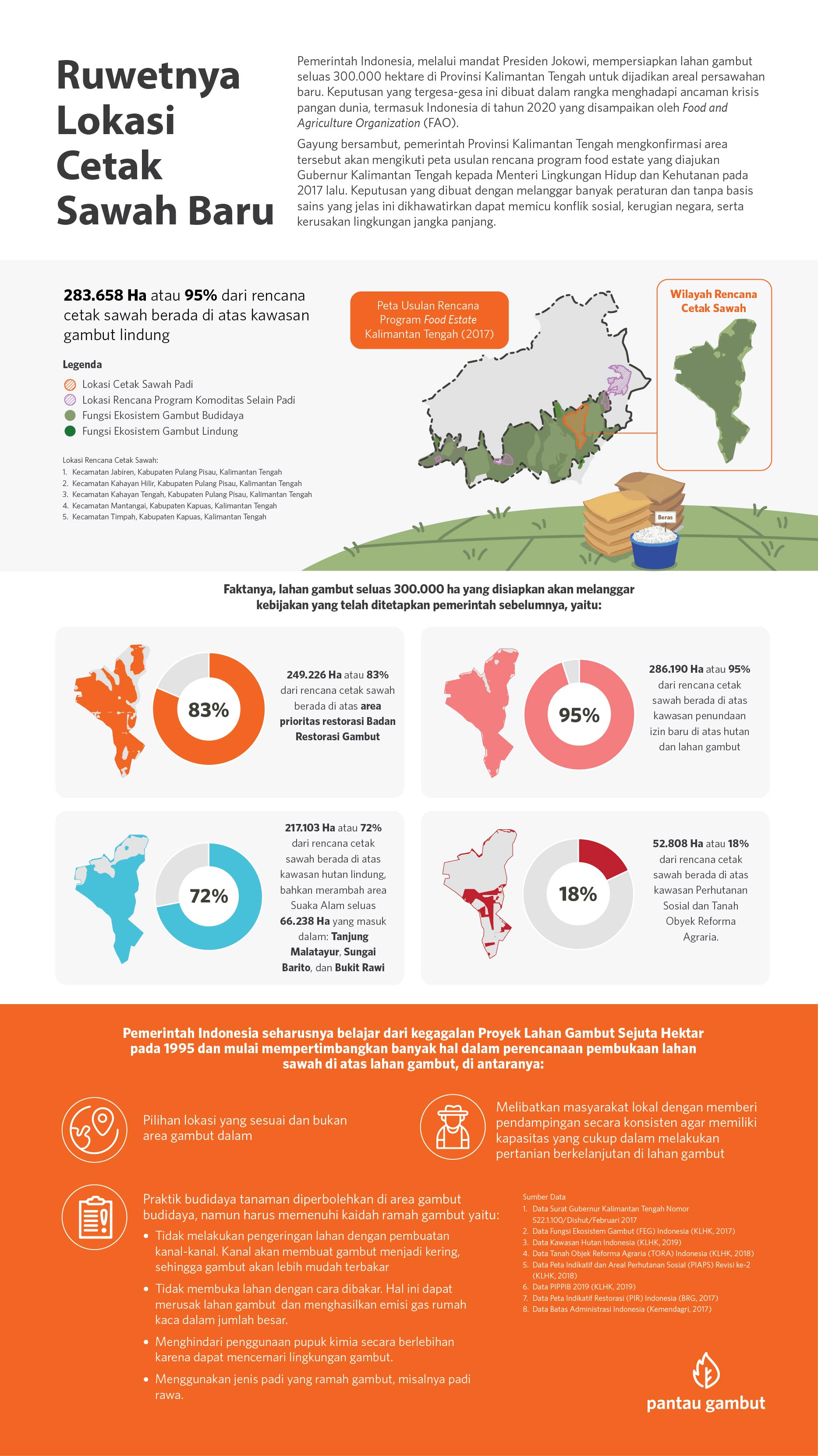 Oleh Admin Pantau GambutDi tengah ancaman krisis pangan akibat pandemi Covid-19, Presiden Jokowi memerintahkan Badan Usaha Milik Negara (BUMN), daerah dan jajaran menterinya untuk mempersiapkan 900.000 hektare lahan gambut menjadi area persawahan baru di Provinsi Kalimantan Tengah. Pemerintah menyatakan lahan gambut seluas 300.000 hektare sudah siap untuk dikelola menjadi lumbung pangan baru. Hasil kajian Pantau Gambut pada peta usulan yang diajukan Gubernur Kalimantan Tengah kepada Menteri Lingkungan Hidup dan Kehutanan (Surat No. 522/102/Dishut) menunjukan area seluas 300.000 hektar ini ternyata tumpang tindih dengan kebijakan lainnya yang dikeluarkan oleh pemerintah.
